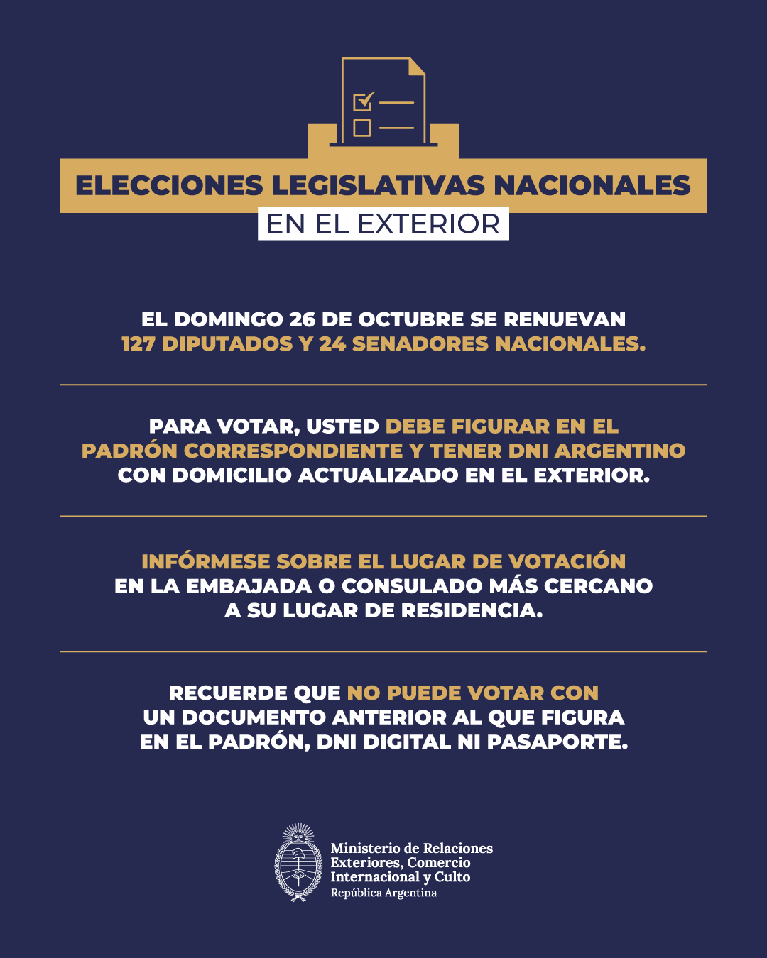 Se recuerda que el voto en el exterior es optativo, y sólo podrán sufragar aquellos que se encuentren registrados en el padrón electoral correspondiente a este Consulado. Cómo documento válido para corroborar su identidad se tomará el DNI que figura en el padrón o una versión posterior (NO SE TOMARÁ COMO VÁLIDO EL PASAPORTE O UNA VERSIÓN ANTERIOR DEL DNI).